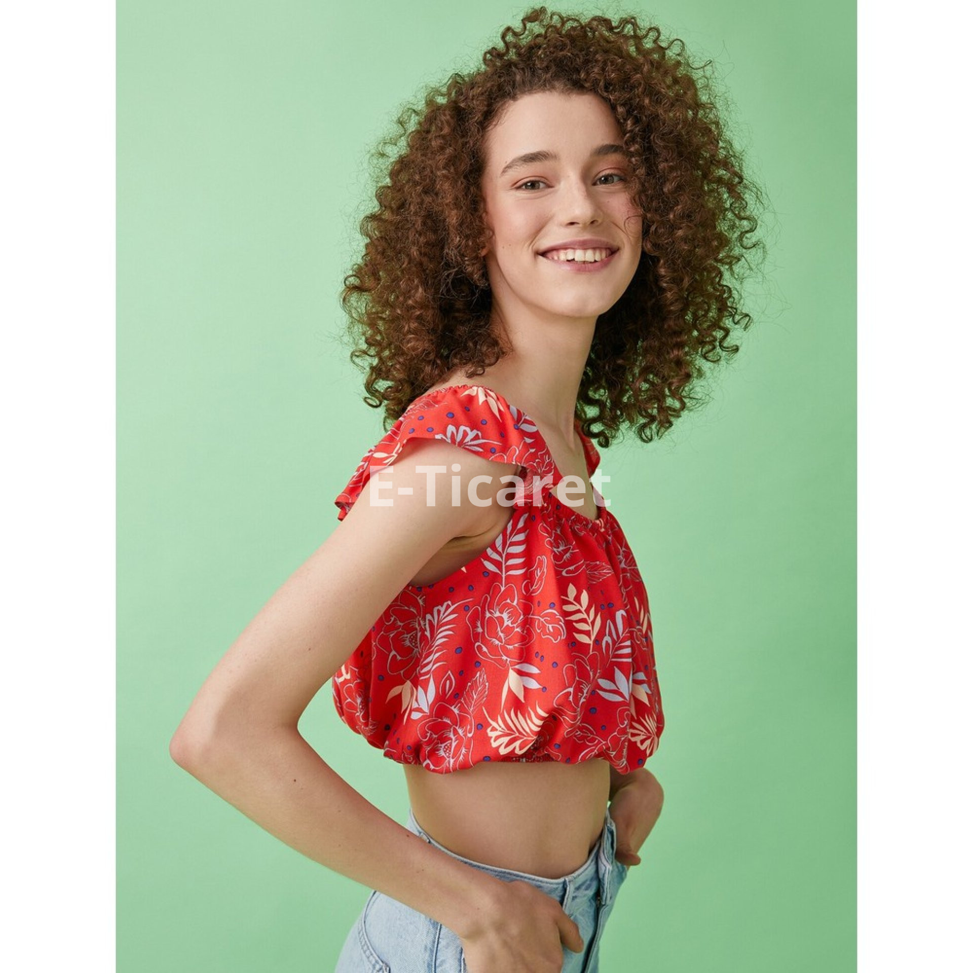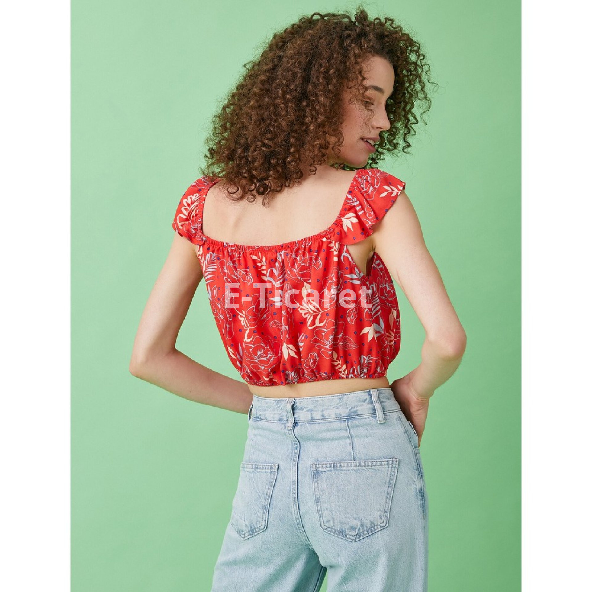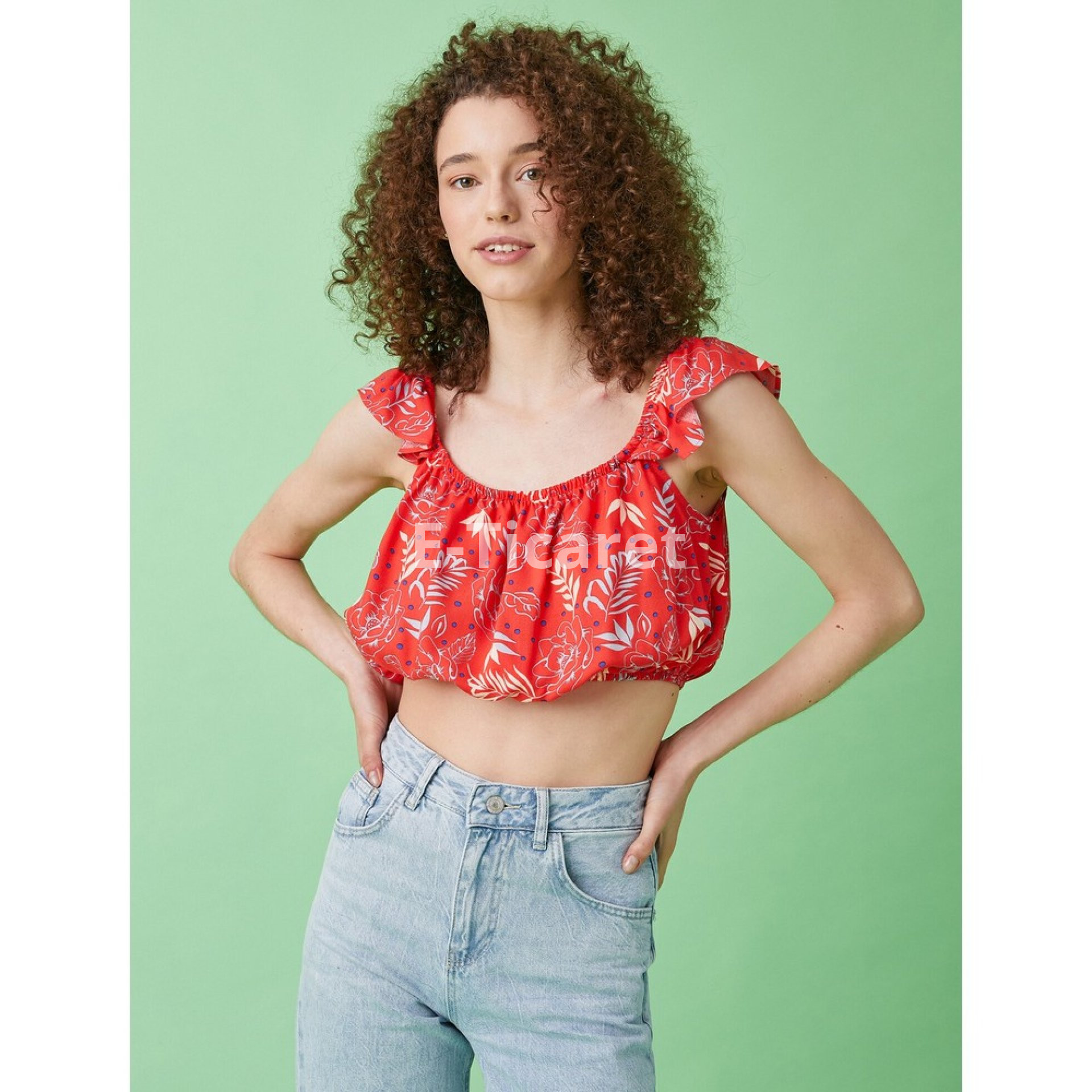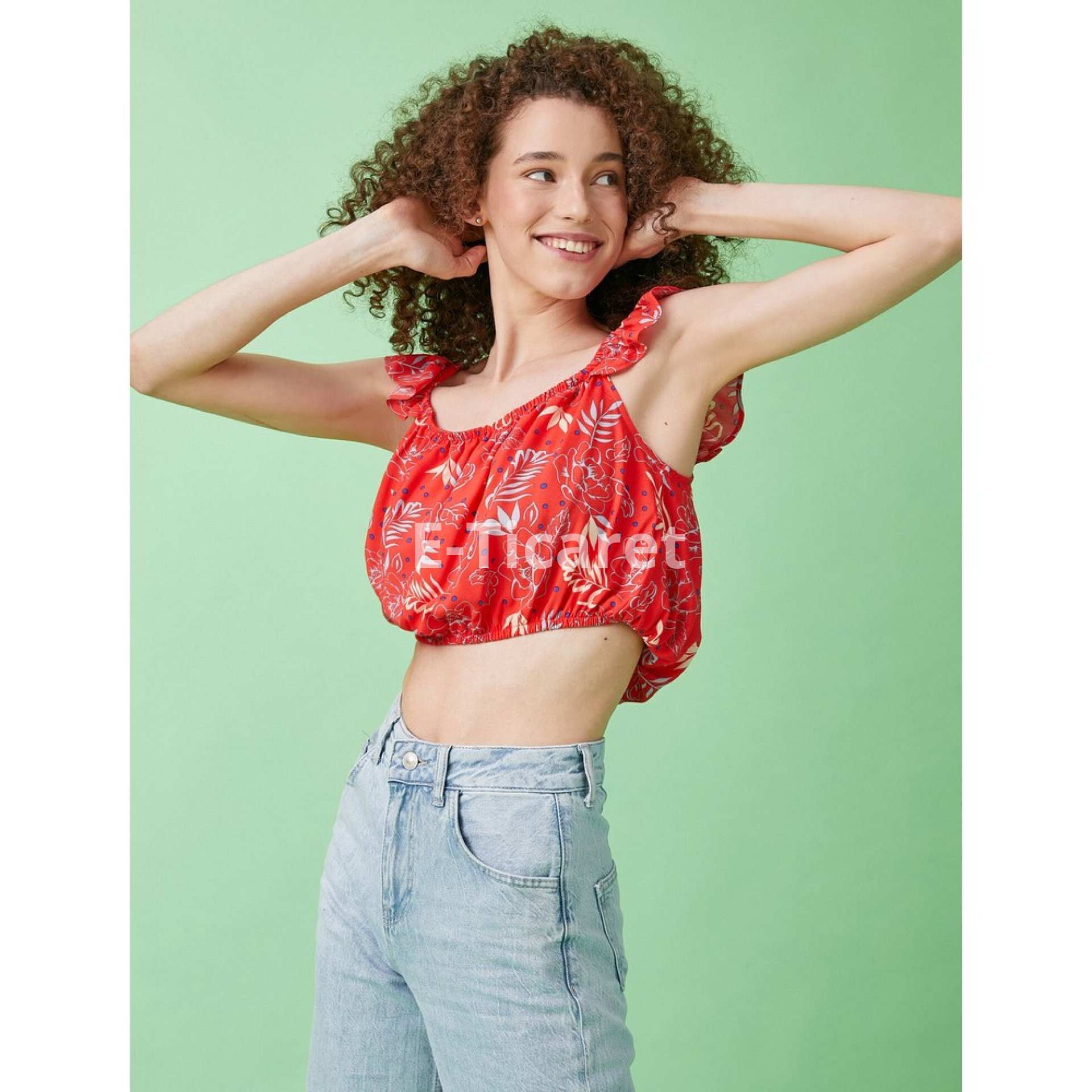 Crop Bluz Desenli Fırfırlı