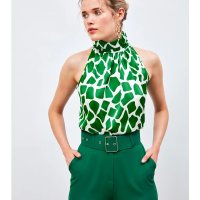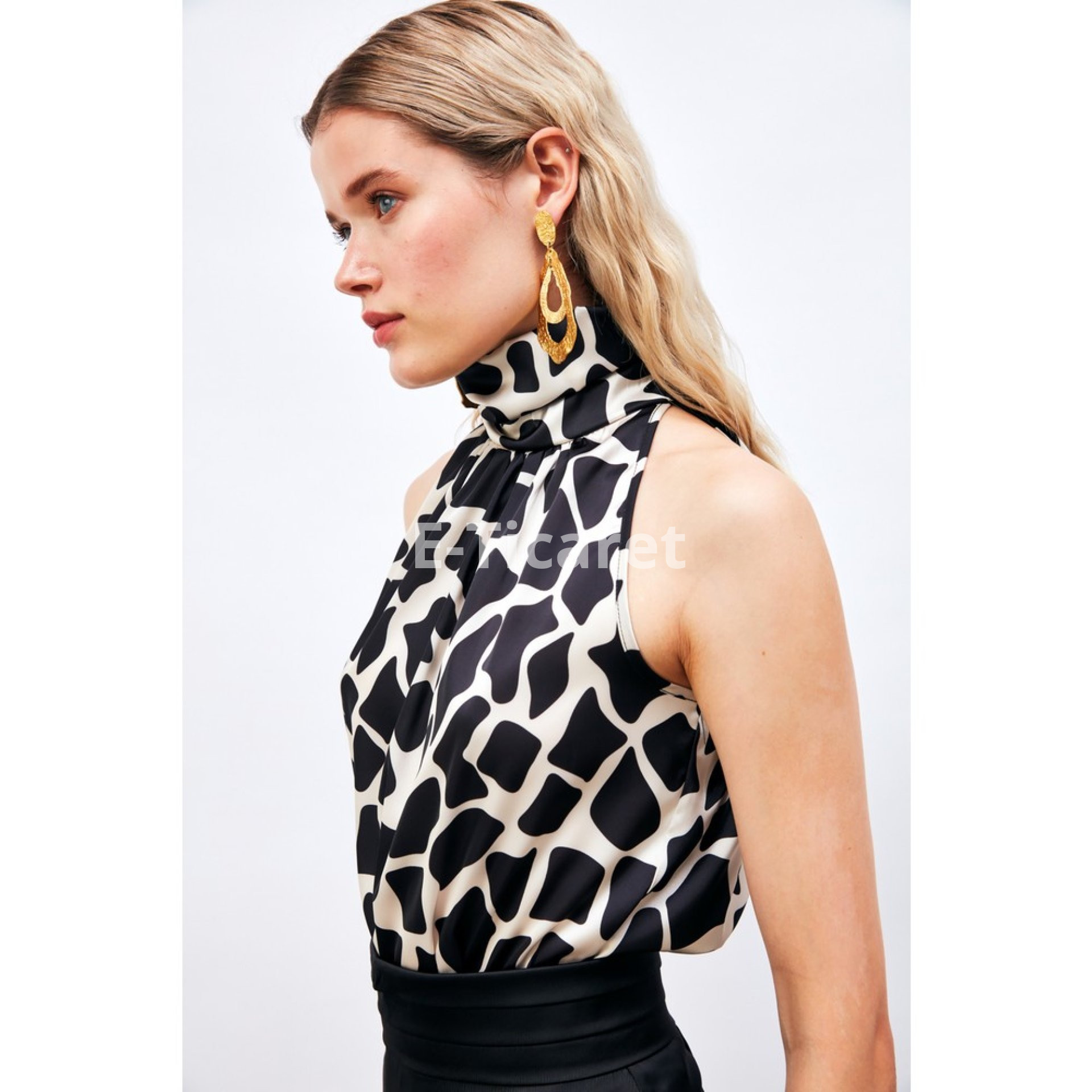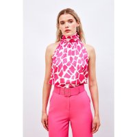 Boğazlı yaka, kalça boy, arka yaka düğmeli kapamalı, kolsuz desenli bluz.
